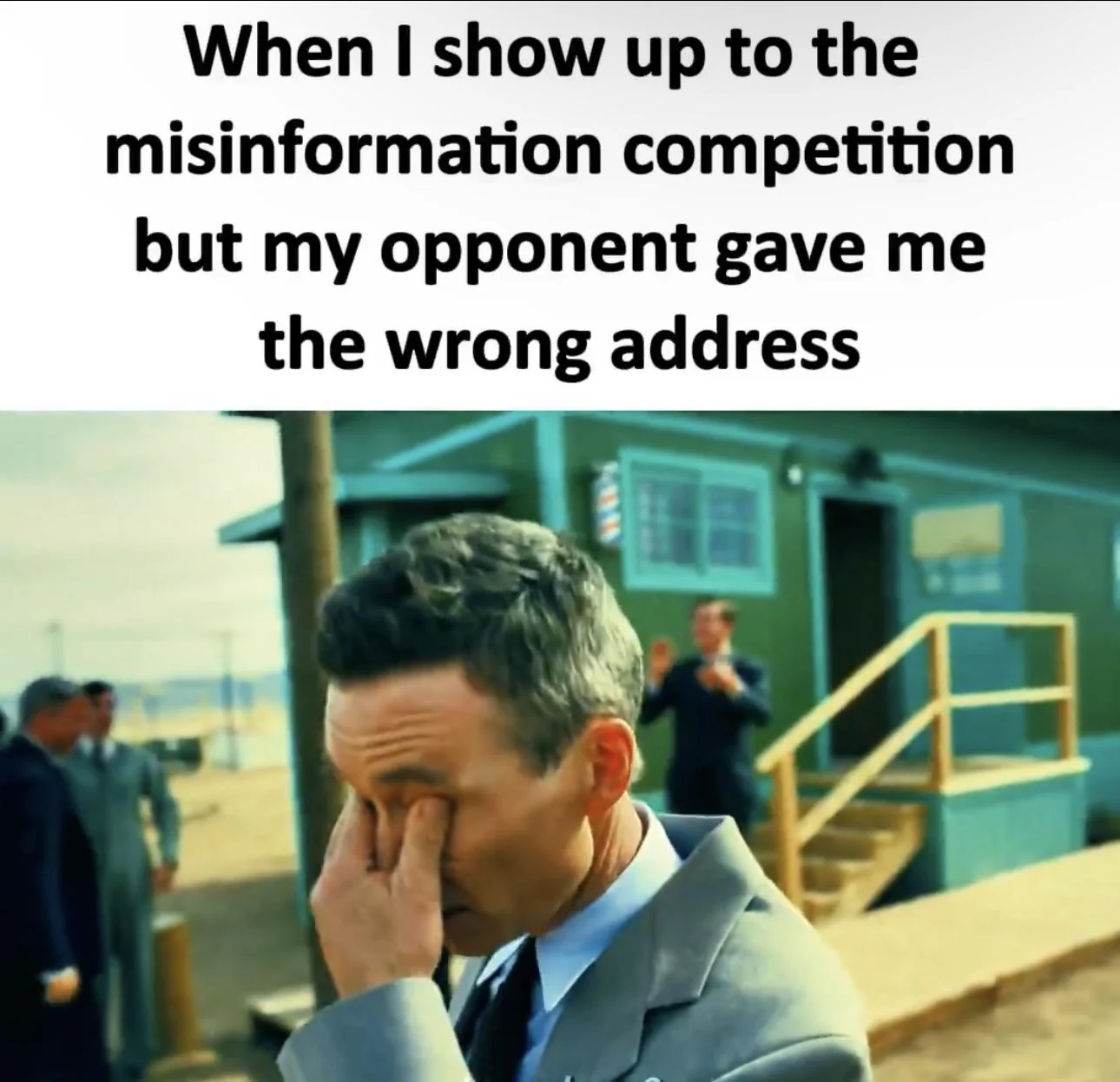 Caption: "When I show up to the misinformation competition but my opponent gave me the wrong address"