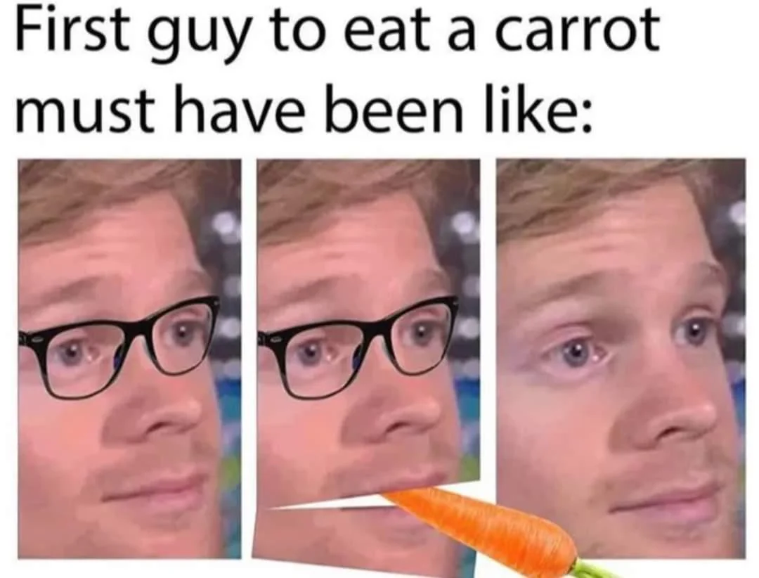 Caption: "First guy to eat a carrot must have been like:"