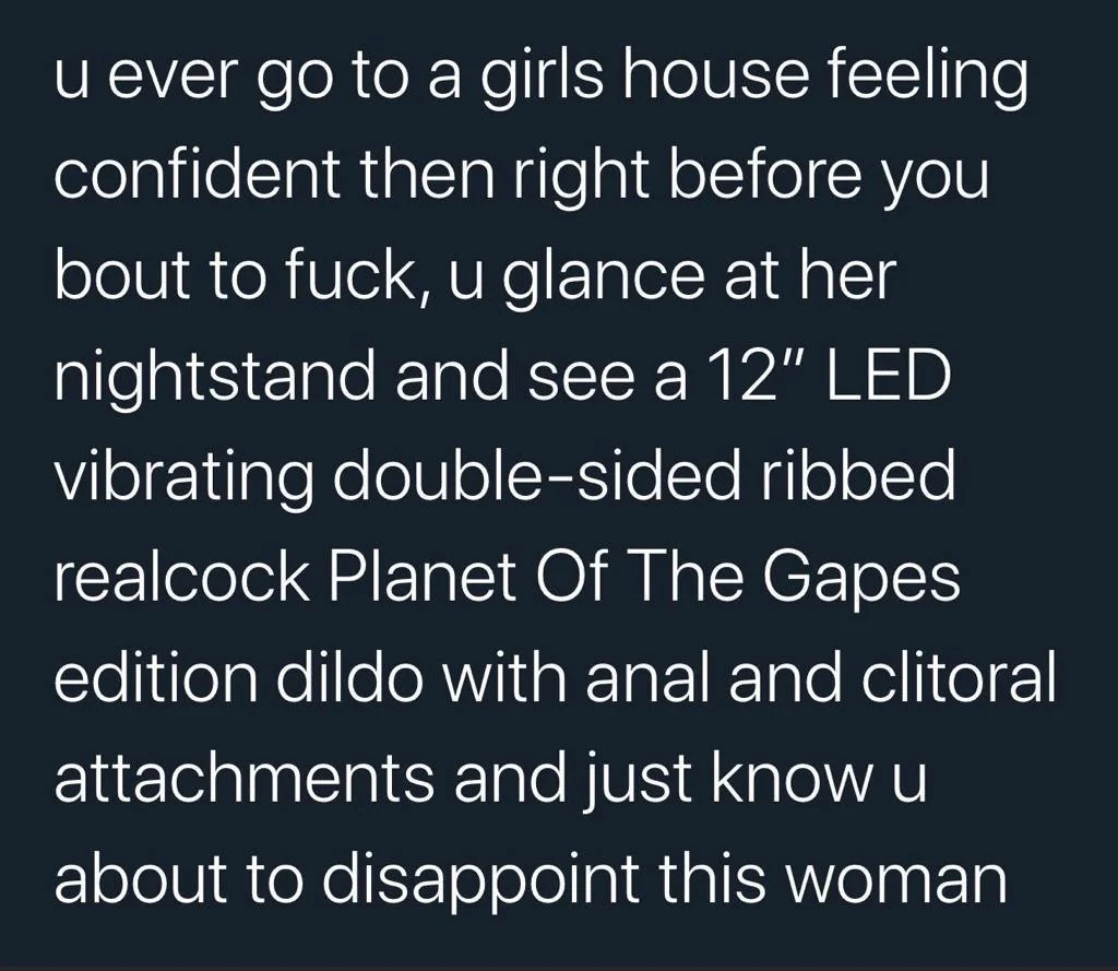 Caption: "u ever go to a girls house feeling confident then right before you bout to fuck, u glance at her nightstand and see a 12" LED vibrating double-sided ribbed realcock Planet Of The Gapes edition dildo with anal and clitoral attachments and just know u about to disappoint this woman"