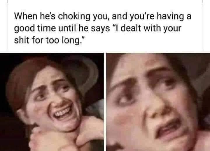Caption: "When he's choking you, and you're having a good time until he says "I dealt with your shit for too long.""