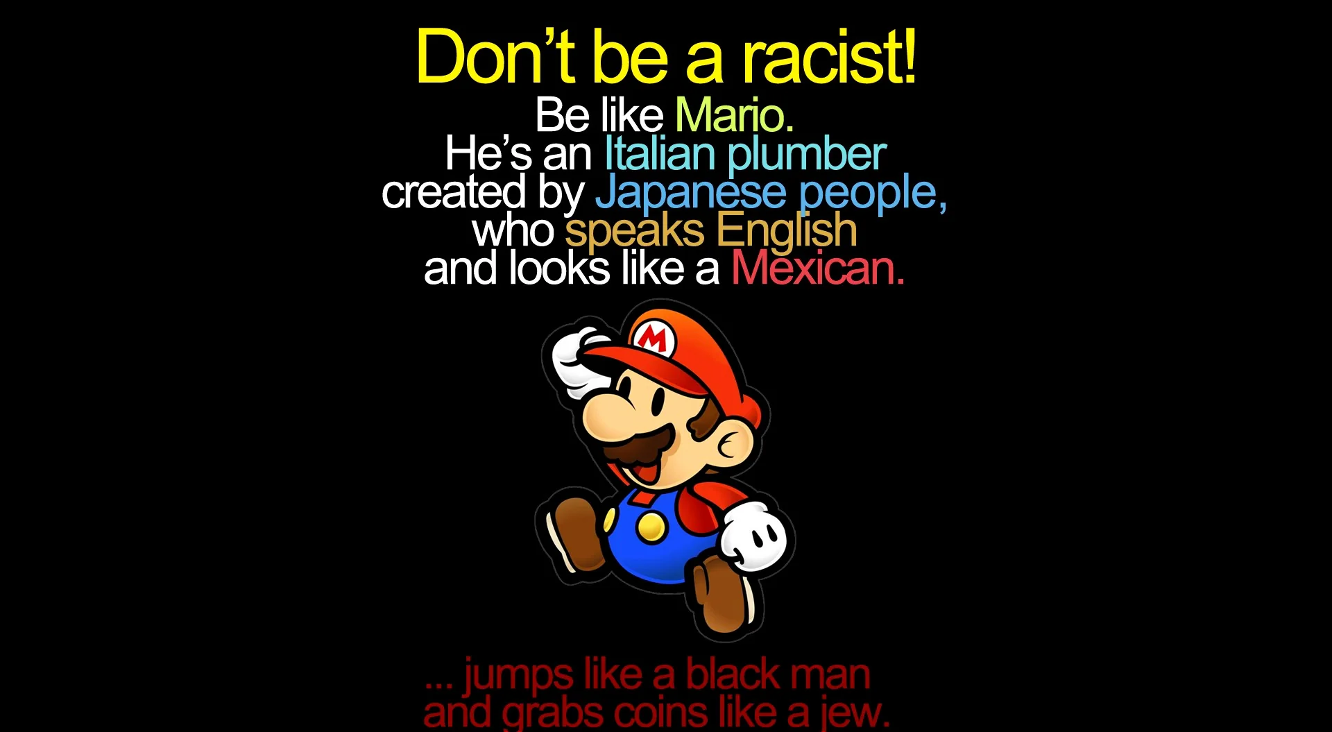 Caption: "Don't be a racist! Be like Mario. He's an Italian plumber created by Japanese people, who speaks English and looks like a Mexican. ... jumps like a black man and grabs coins like a jew."