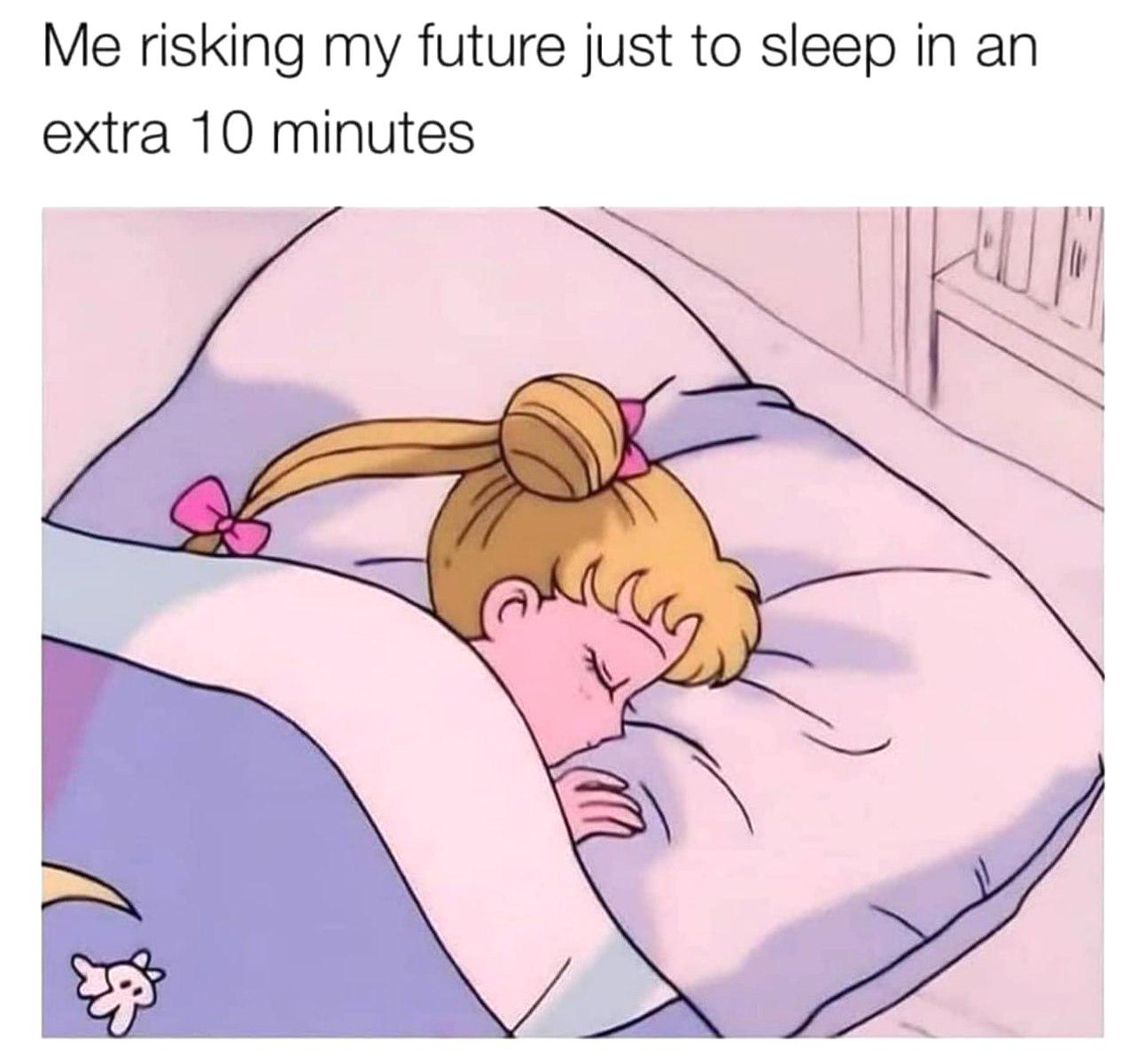 Caption: "Me risking my future just to sleep in an extra 10 minutes"