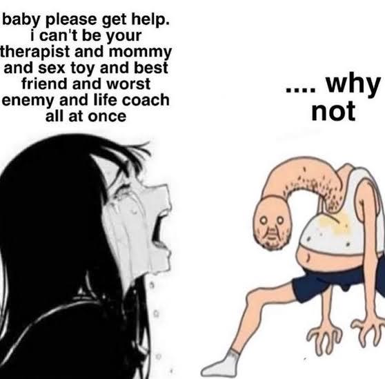 Caption: "baby please get help. I can't be your therapist and mommy and sex toy and best friend and worst enemy and life coach all at once .... why not"
