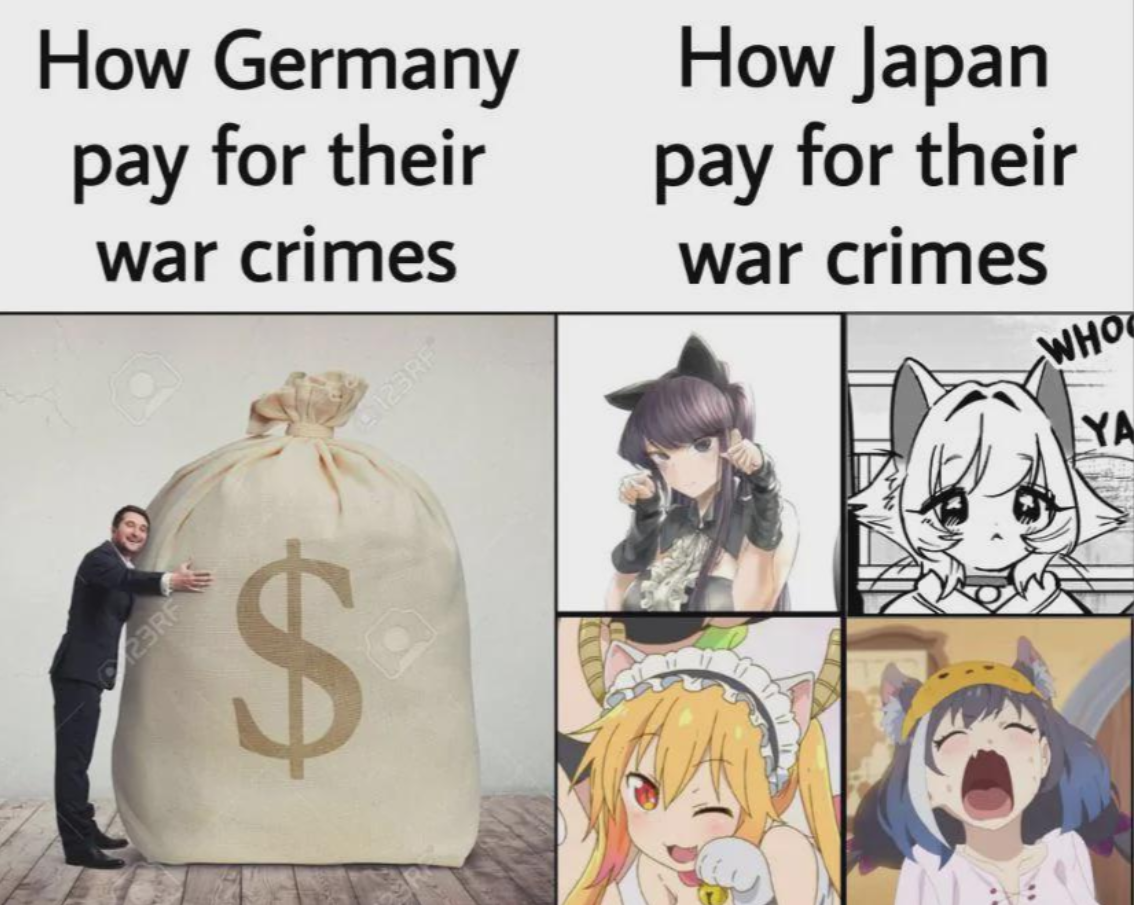 Caption: "How Germany pay for their war crimes - How Japan pay for their war crimes"