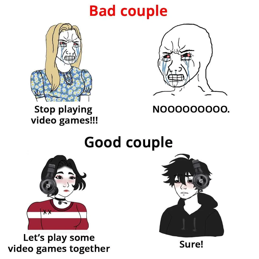 Caption: "Bad couple Stop playing video games!!! - NOOOOOOOOO. Good couple Let's play some video games together - Sure!"