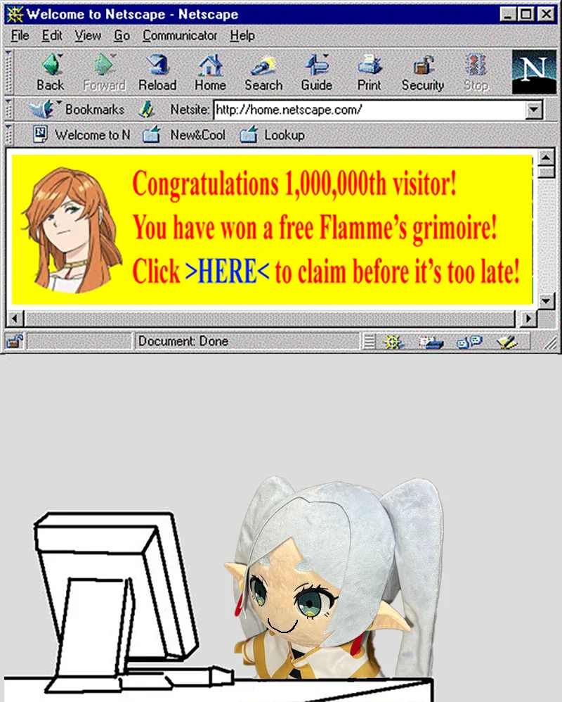 Caption: "congratulations 1,000,000th visitor! You have won a free Flamme's grimoire! Click >HERE< to claim before it's too late!"