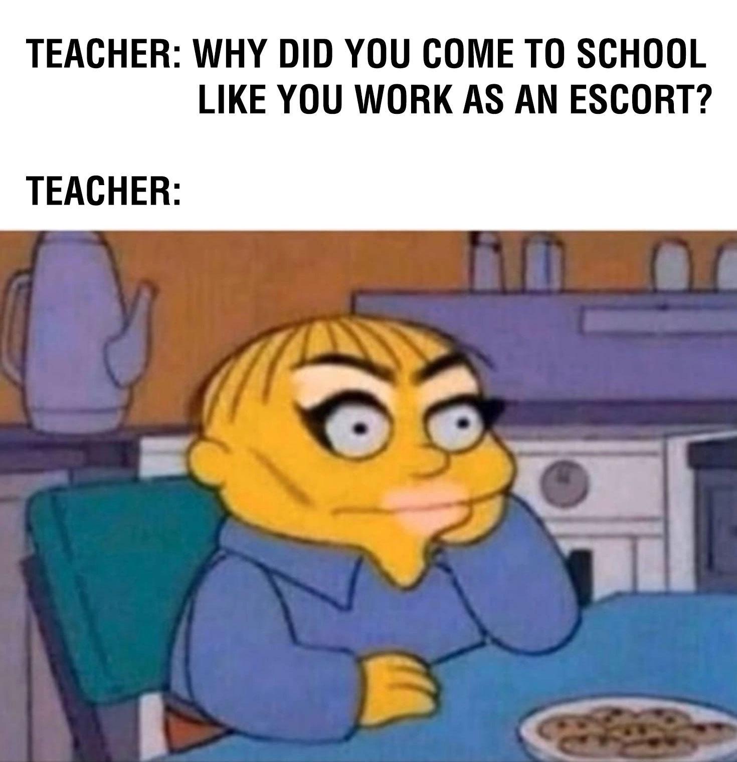 Caption: "Teacher: why did you come to school like you work as an escort? Teacher:"