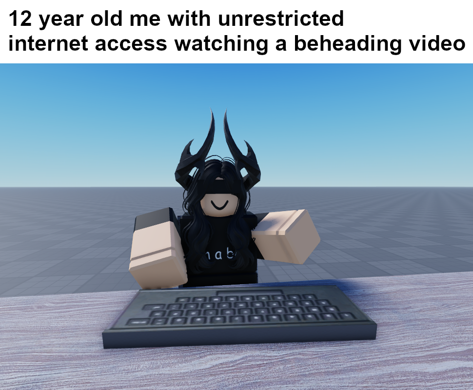 Caption: "12 year old me with unrestricted internet access watching a beheading video"