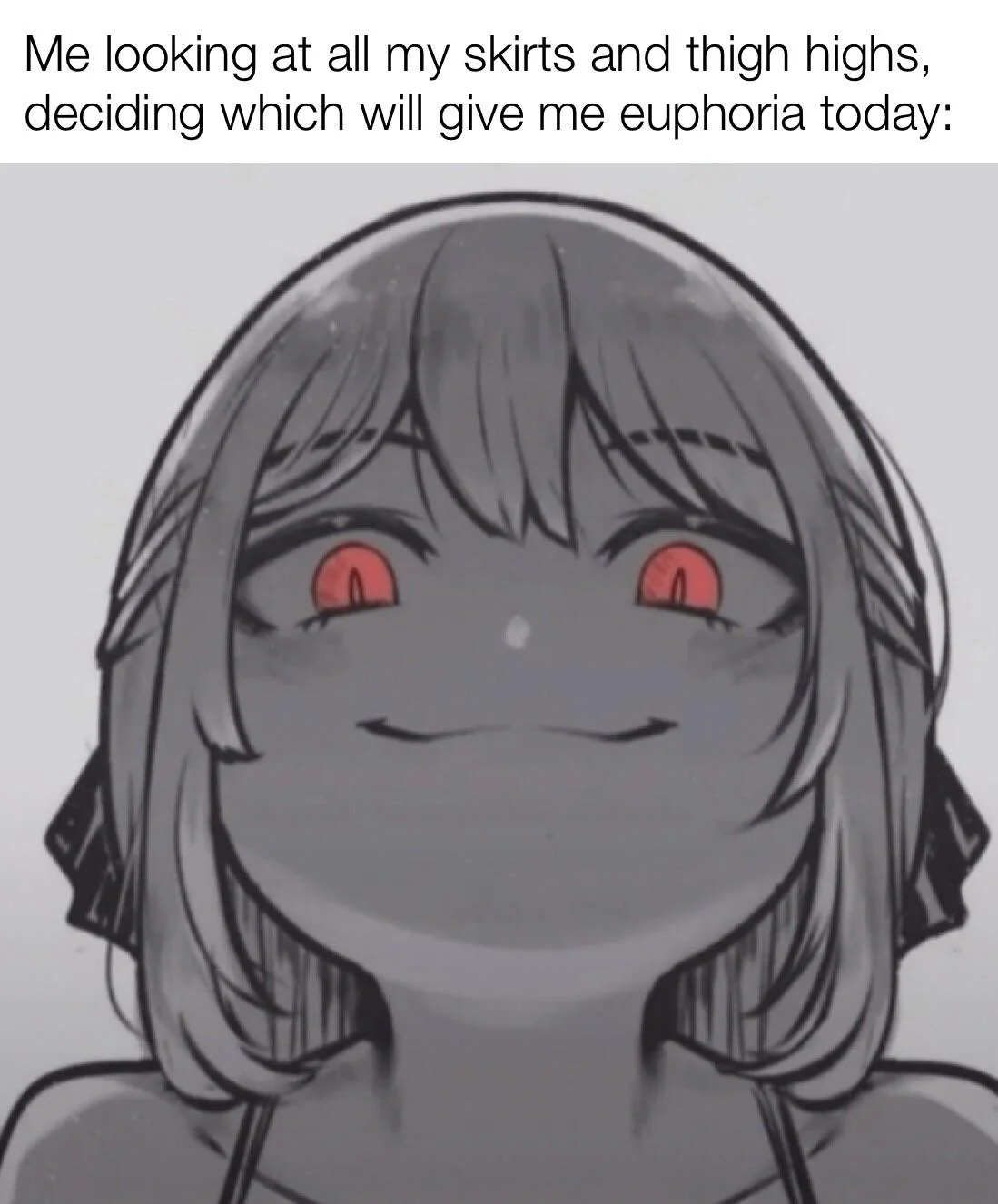 Caption: "Me looking at all my skirts and thigh highs, deciding which will give me euphoria today"