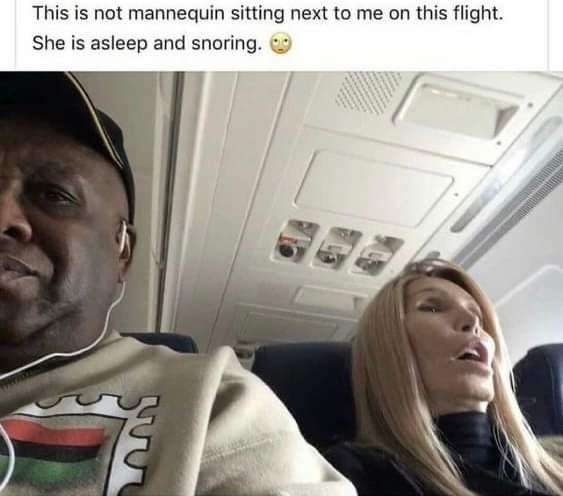 Caption: "This is not mannequin sitting next to me on this flight. She is asleep and snoring. 🙄"
