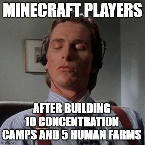 Caption: "Minecraft players after building 10 concentration camps and 5 human farms"