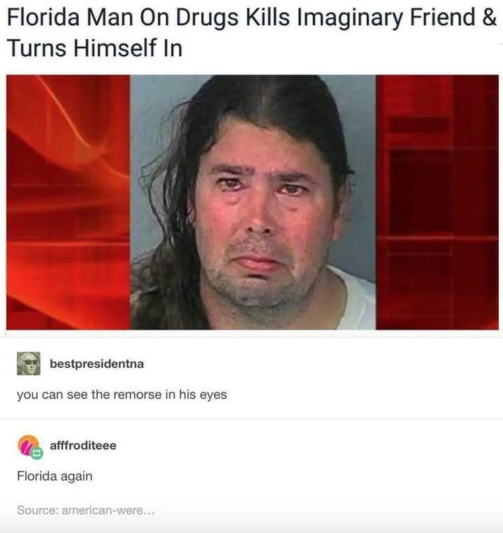 Caption: "Florida Man On Drugs Kills Imaginary Friend & Turns Himself In"