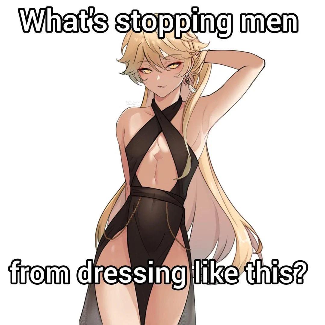 Caption: "What's stopping men from dressing like this?"