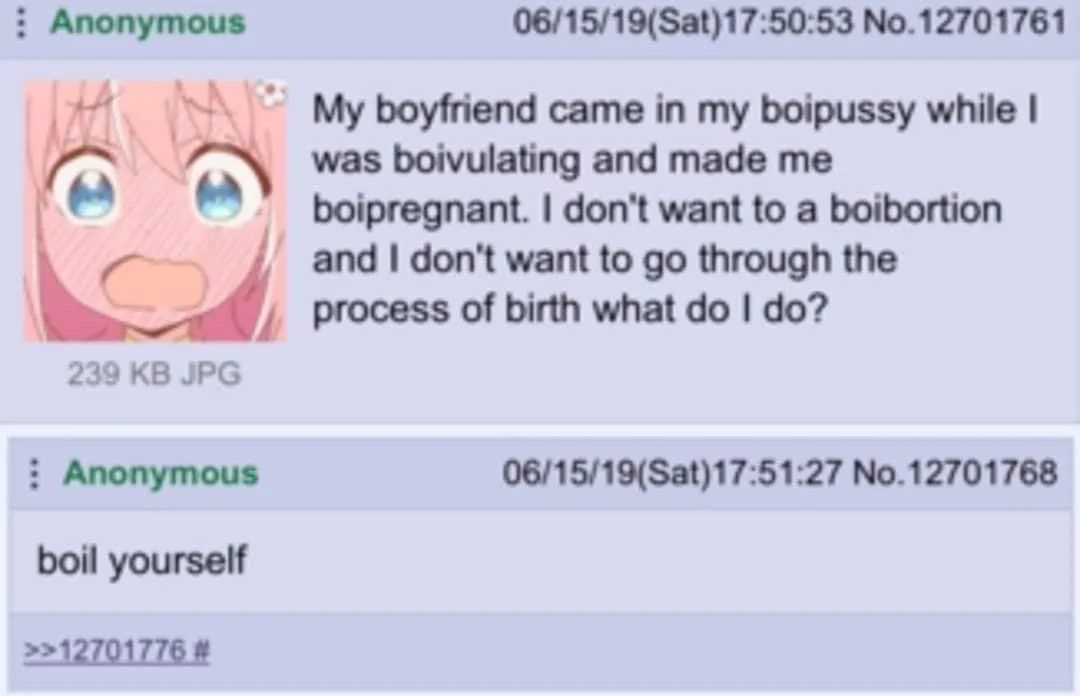 Caption: "My boyfriend came in my boipussy while I was boivulating and made me boipregnant. I don't want to a boibortion and I don't want to go through the process of birth what do I do?"