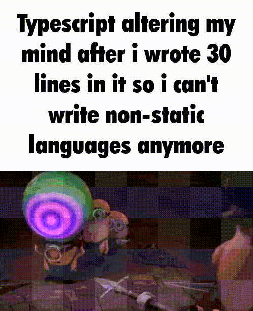 Caption: "TypeScript altering my mind after I wrote 30 lines in it so I can't write non-static languages anymore"