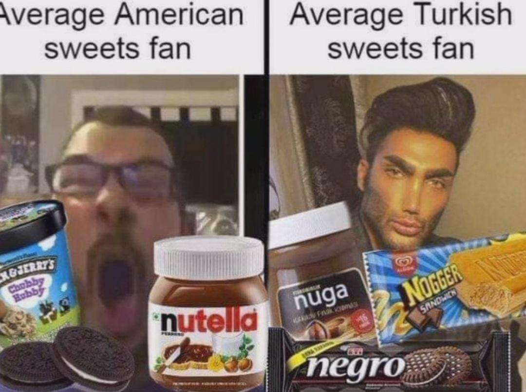 Caption: "Average American sweets fan - Average Turkish sweets fan"