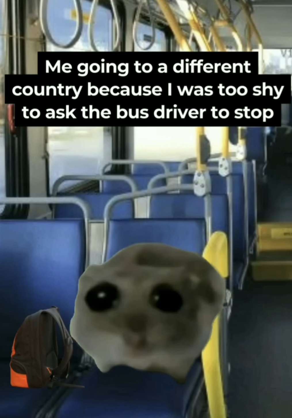 Caption: "Me going to a different country because I was too shy to ask the bus driver to stop"