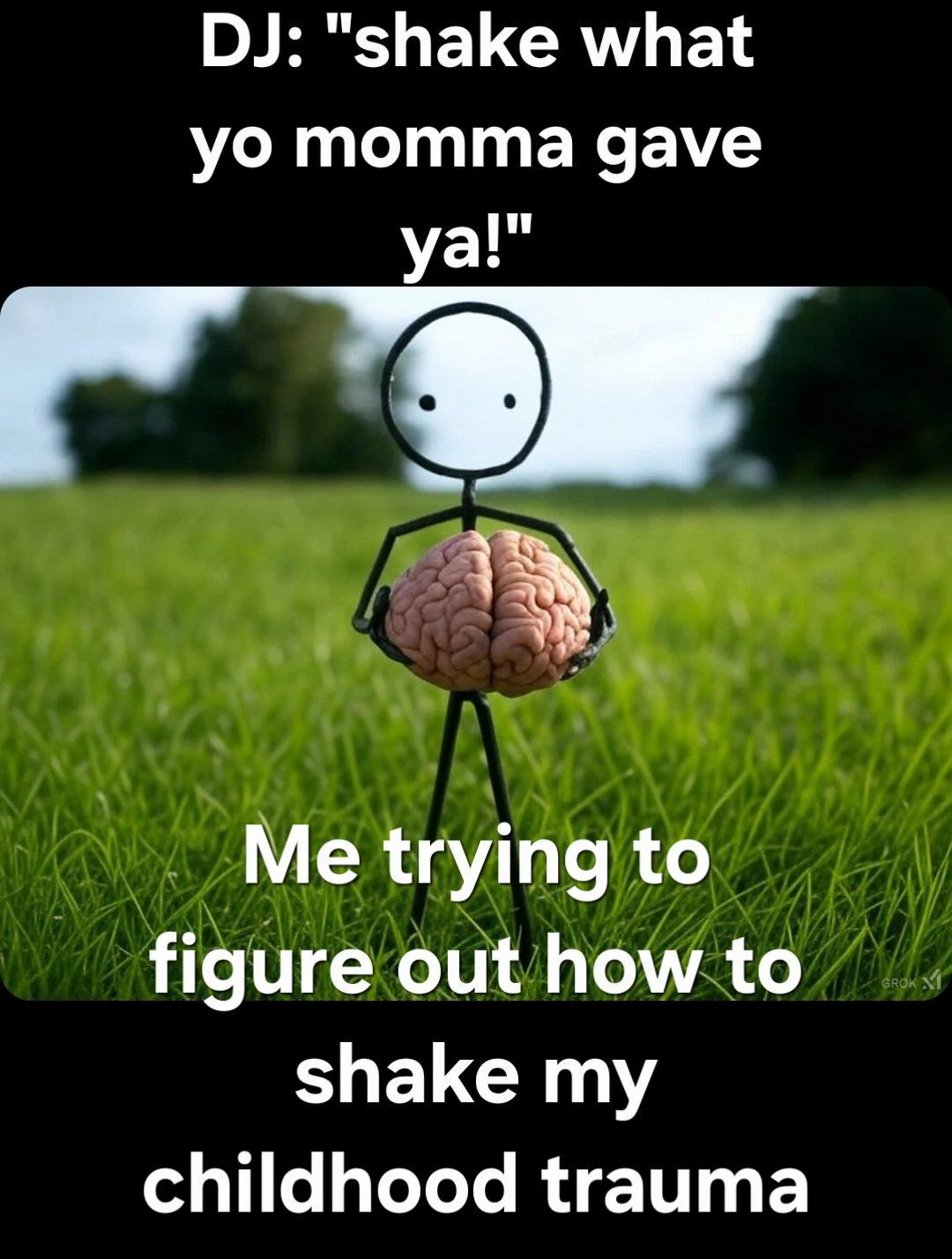 Caption: "DJ: "shake what yo momma gave ya!" Me trying to figure out how to shake my childhood trauma"