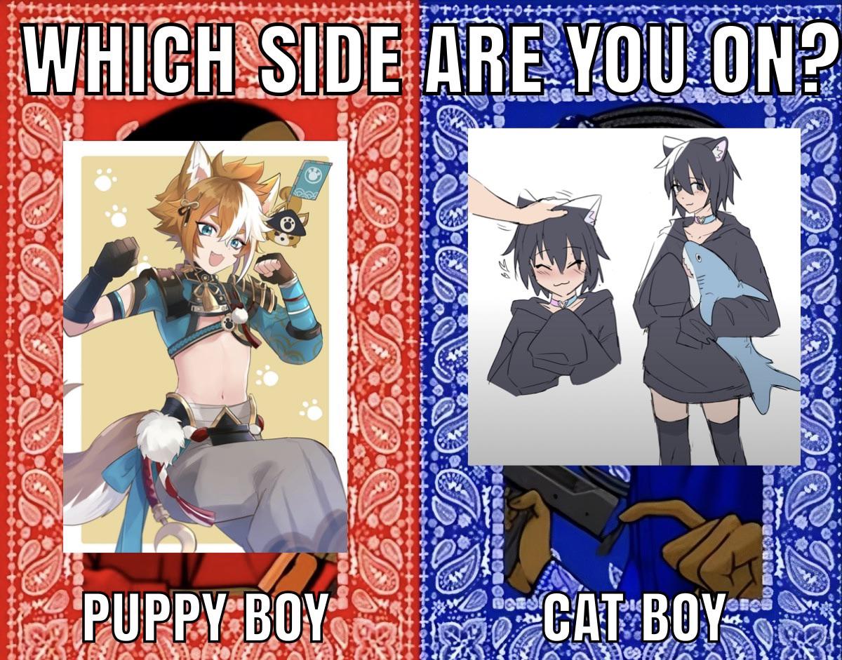 Caption: "Which side are you on? Puppy boy - Cat boy"