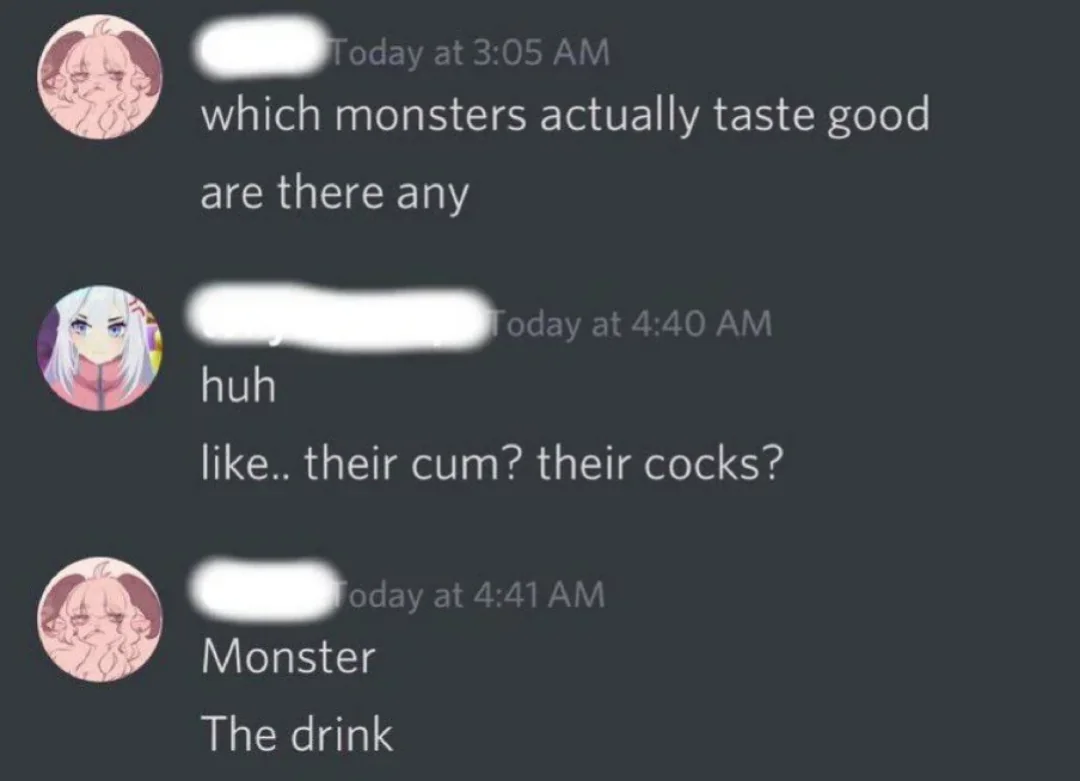 Caption: "which monsters actually taste good huh; like.. their cum? their cocks? Monster; The drink"
