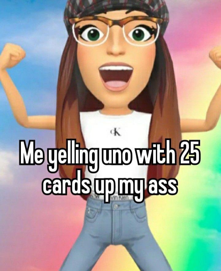 Caption: "Me yelling uno with 25 cards up my ass"