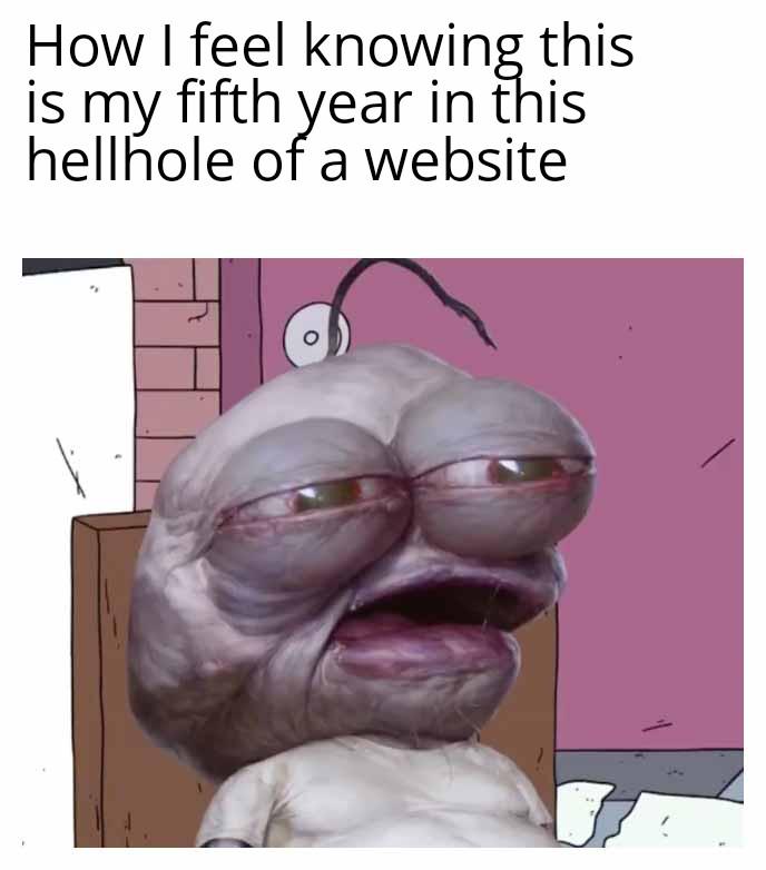 Caption: "How I feel knowing this is my fifth year in this hellhole of a website"