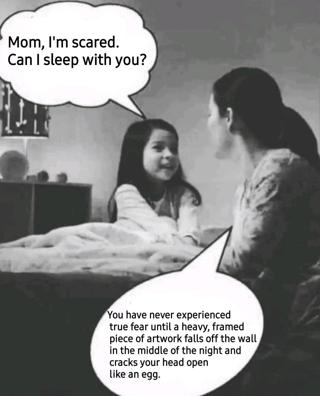 Caption: "Mom, I'm scared. Can I sleep with you? - You have never experienced true fear until a heavy, framed piece of artwork falls off the wall in the middle of the night and cracks your head open like an egg."