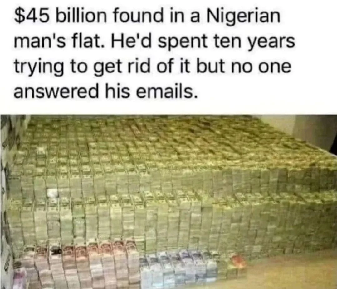 Caption: "$45 billion found in a Nigerian man's flat. He'd spent ten years trying to get rid of it but no one answered his emails."