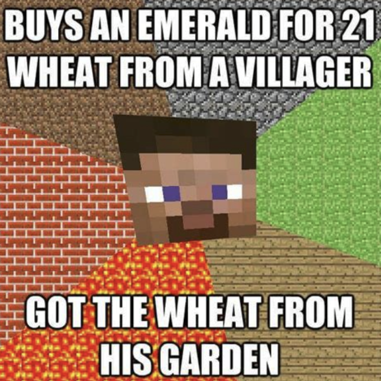 Caption: "Buys an emerald for 21 wheat from a villager Got the wheat from his garden"