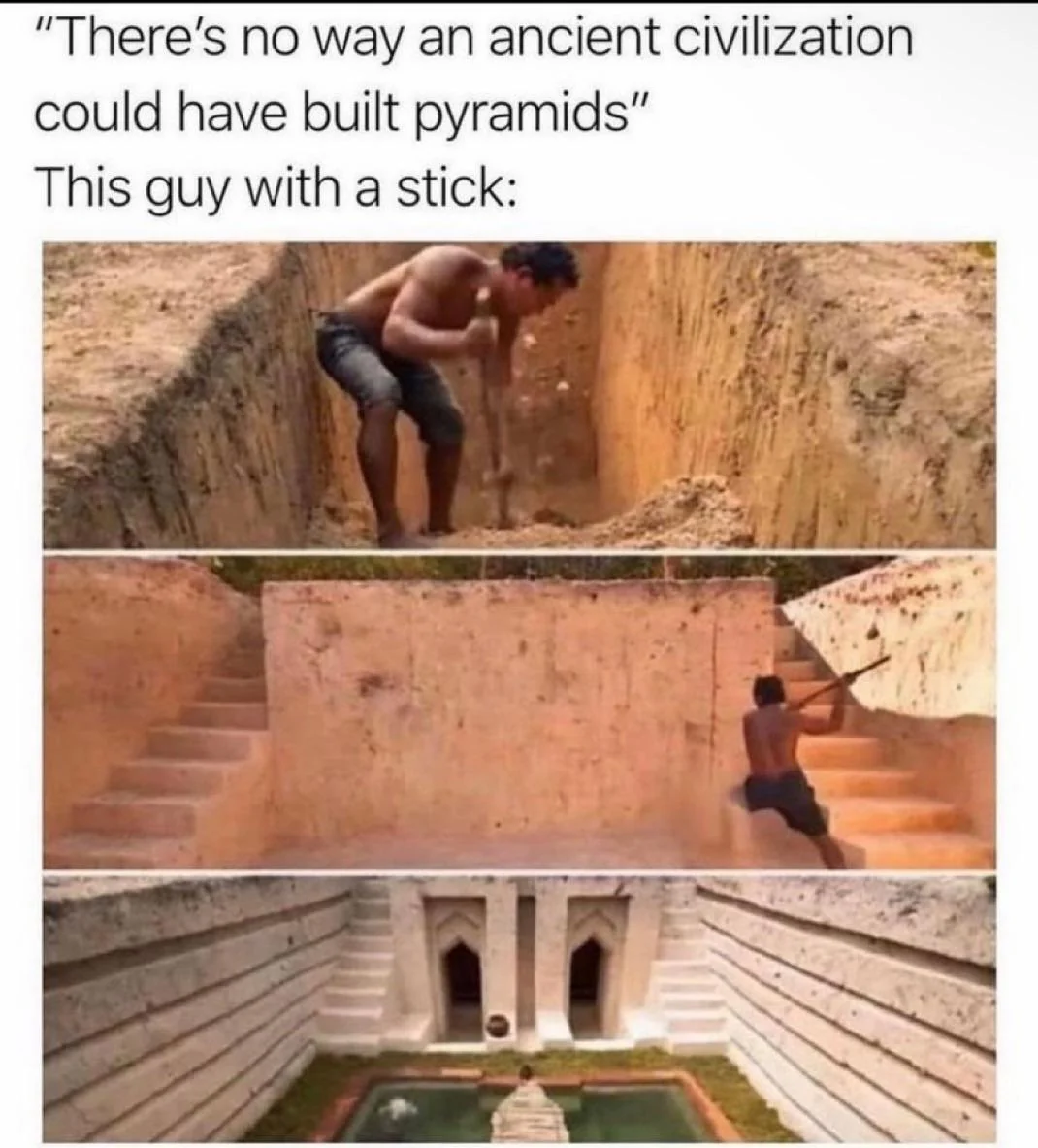 Caption: ""There's no way an ancient civilization could have built pyramids" This guy with a stick:"