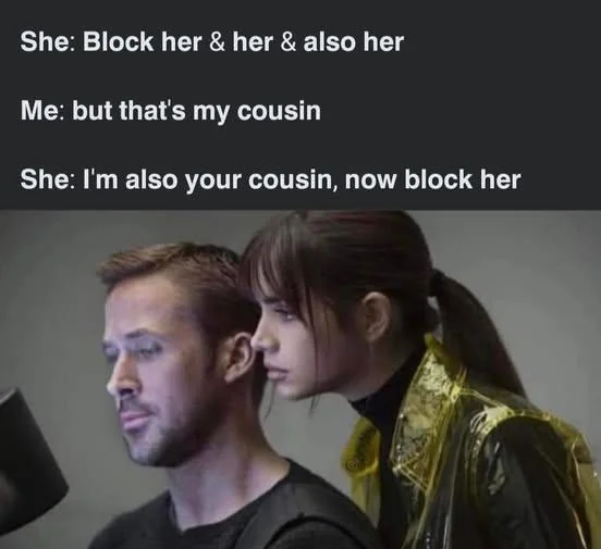 Caption: "She: Block her & her & also her Me: but that's my cousin She: I'm also your cousin, now block her"