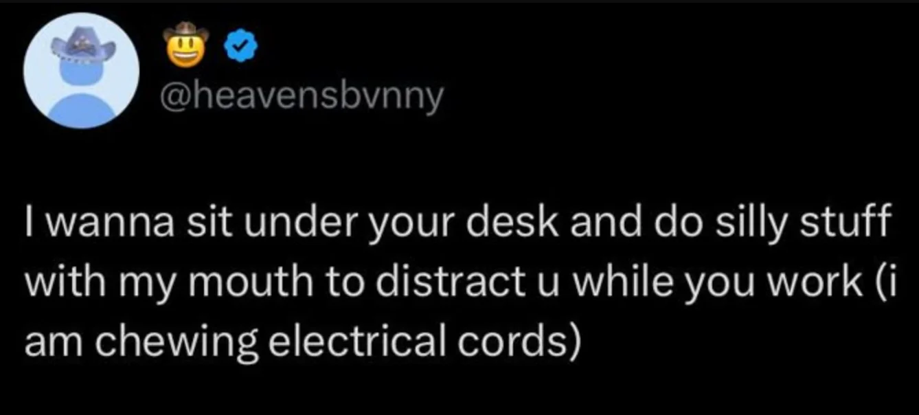 Caption: "I wanna sit under your desk and do silly stuff with my mouth to distract u while you work (i am chewing electrical cords)"