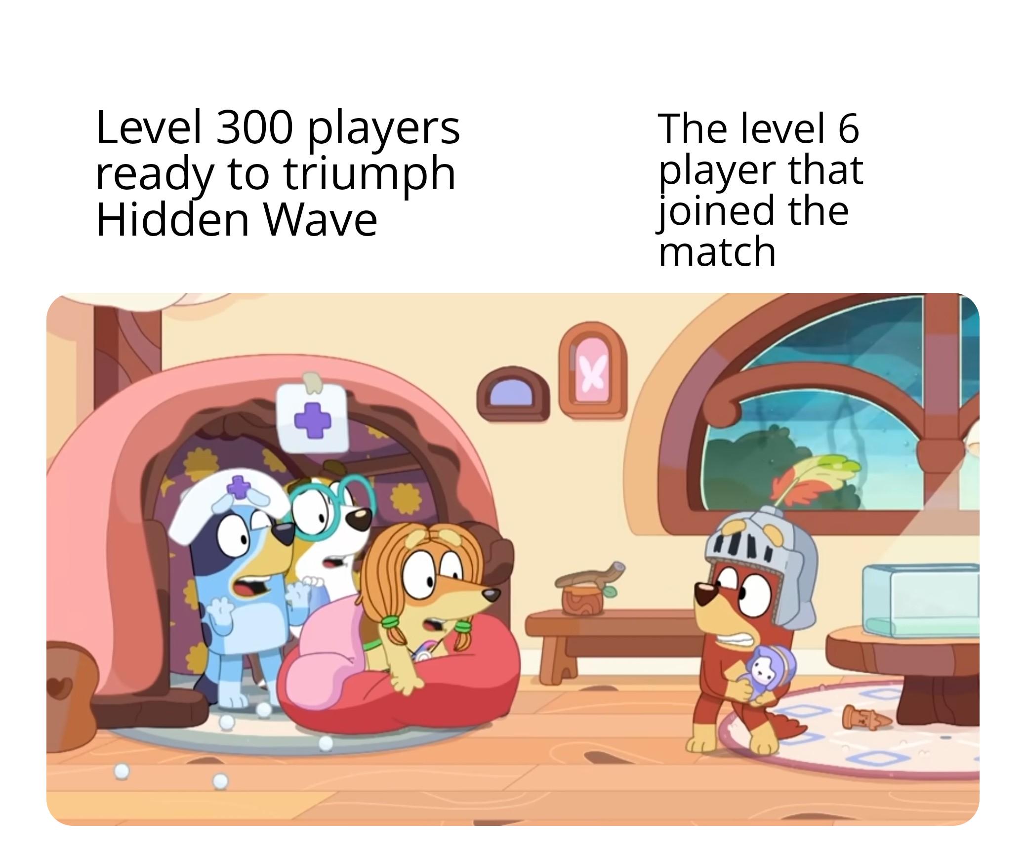 Caption: "level 300 players ready to triumph Hidden Wave - The level 6 player that joined the match"