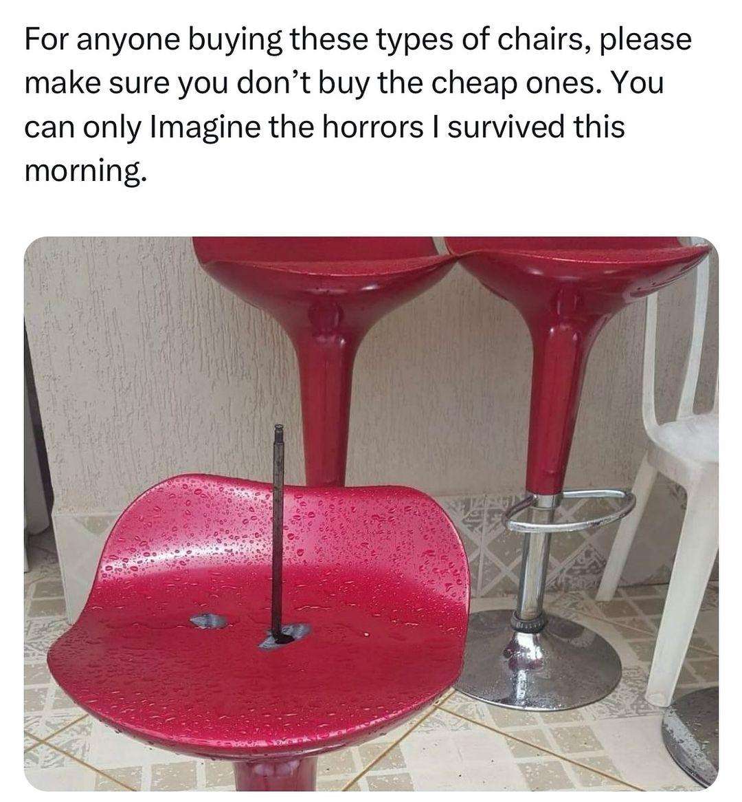 Caption: "For anyone buying these types of chairs, please make sure you don't buy the cheap ones. You can only imagine the horrors I survived this morning."