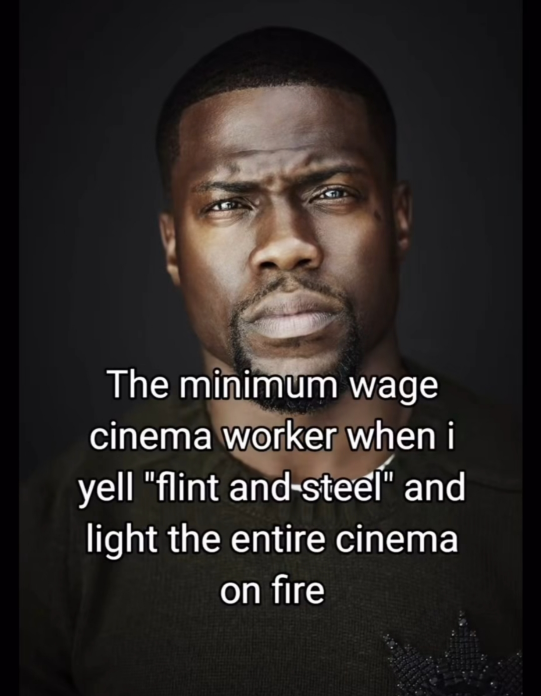 Caption: "The minimum wage cinema worker when i yell "flint and steel" and light the entire cinema on fire"