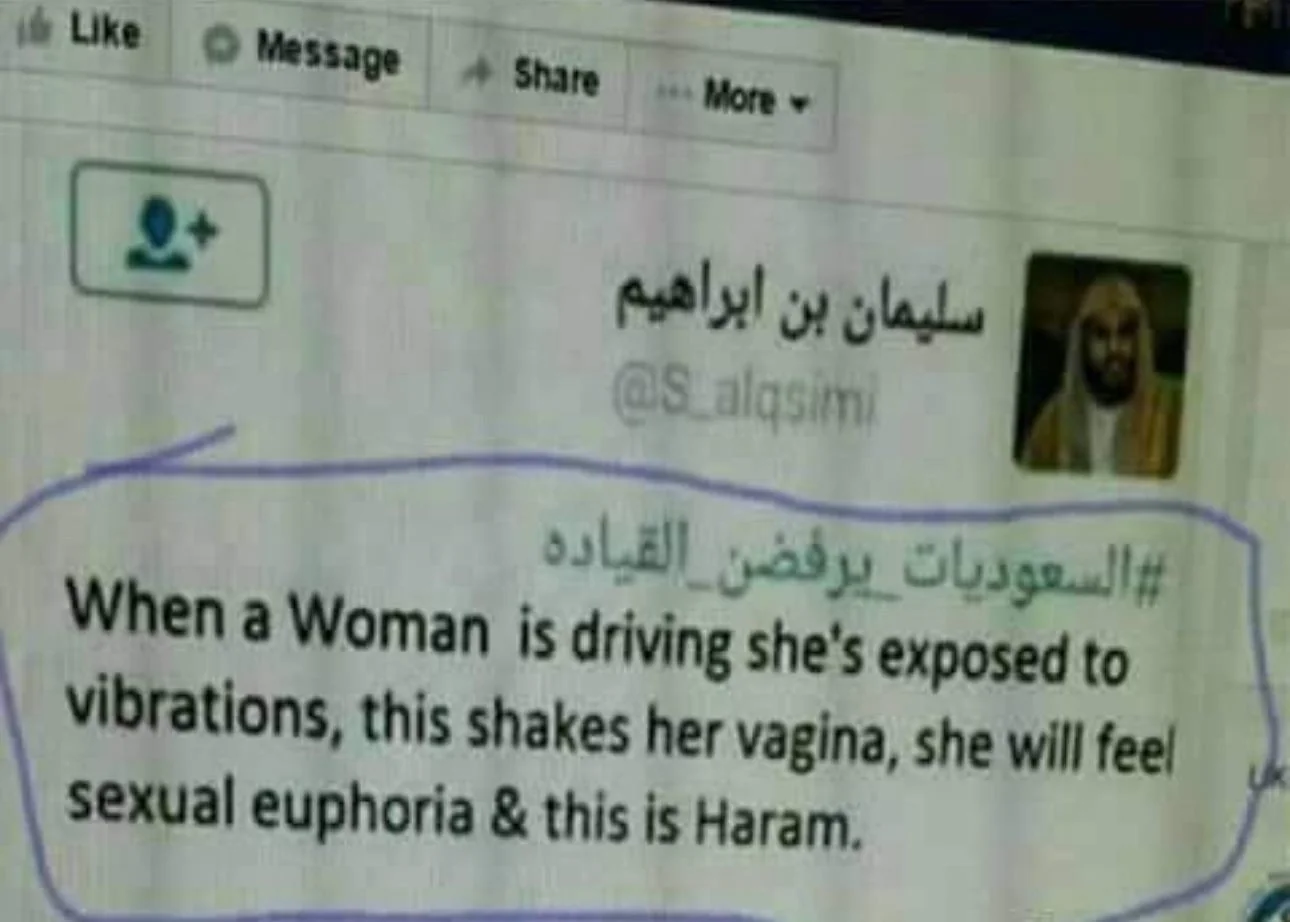 Caption: "When a Woman is driving she's exposed to vibrations, this shakes her vagina, she will feel sexual euphoria & this is Haram."