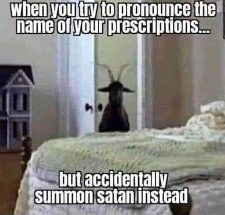Caption: "when you try to pronounce the name of your prescriptions... but accidentally summon satan instead"