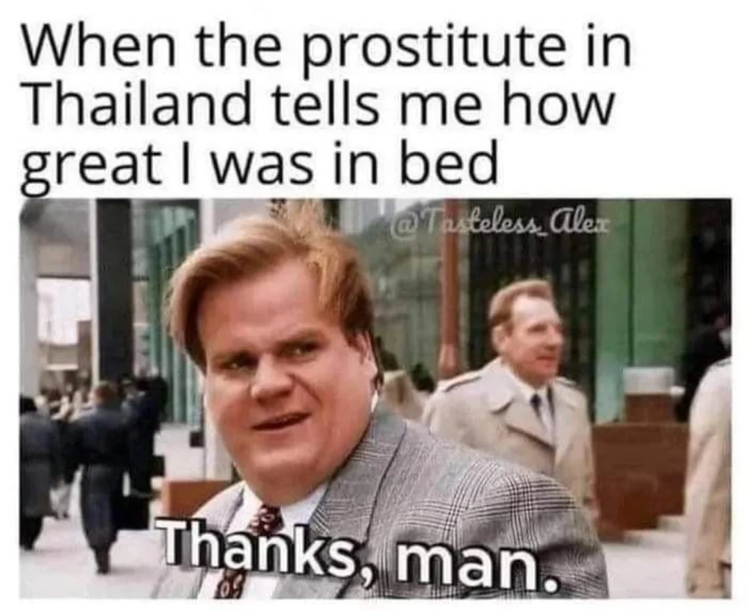 Caption: "When the prostitute in Thailand tells me how great I was in bed Thanks, man."