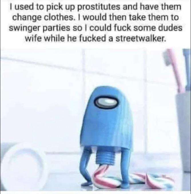 Caption: "I used to pick up prostitutes and have them change clothes. I would then take them to swinger parties so I could fuck some dudes wife while he fucked a streetwalker."