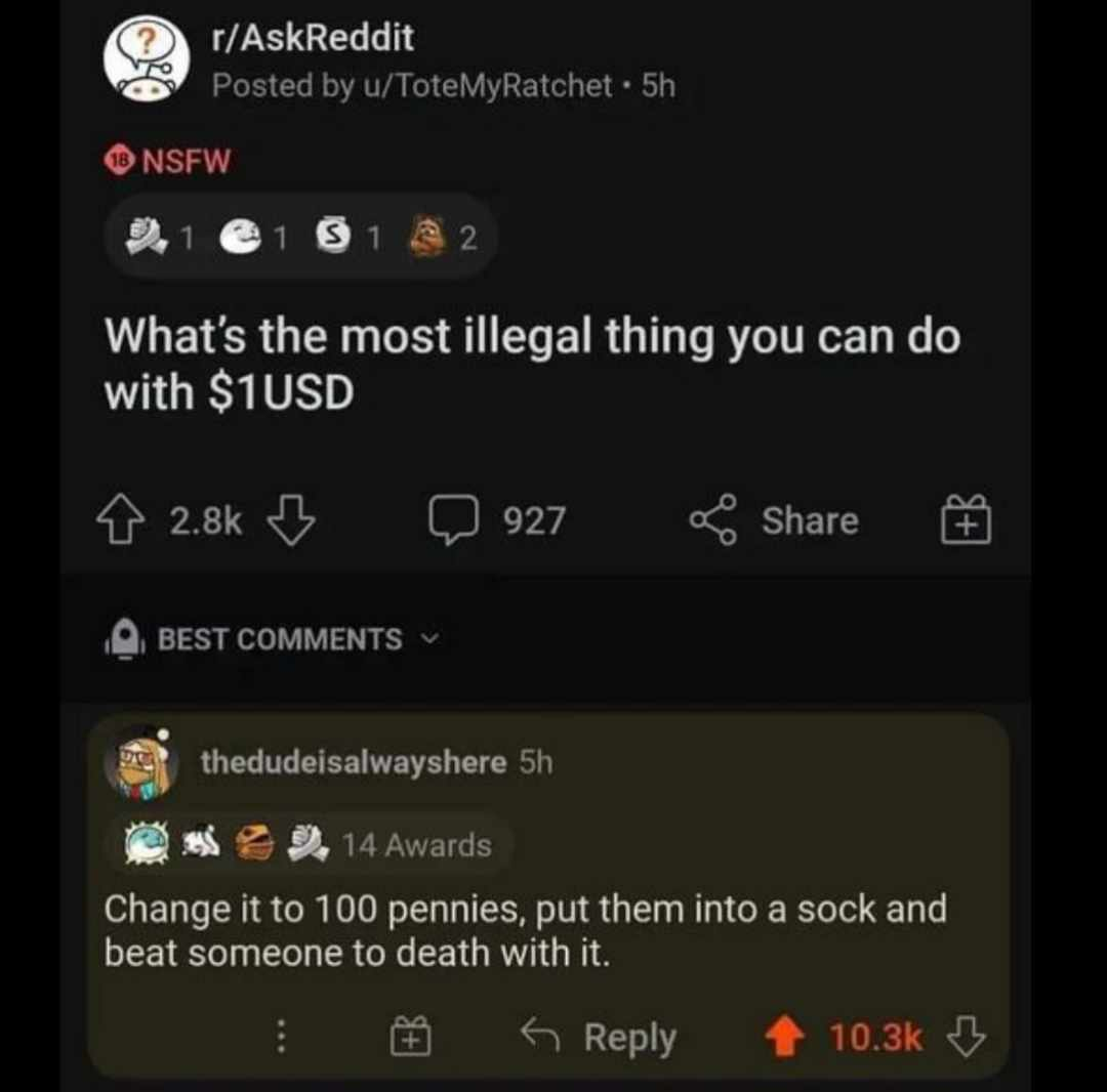 Caption: "What's the most illegal thing you can do with $1USD Change it to 100 pennies, put them into a sock and beat someone to death with it."