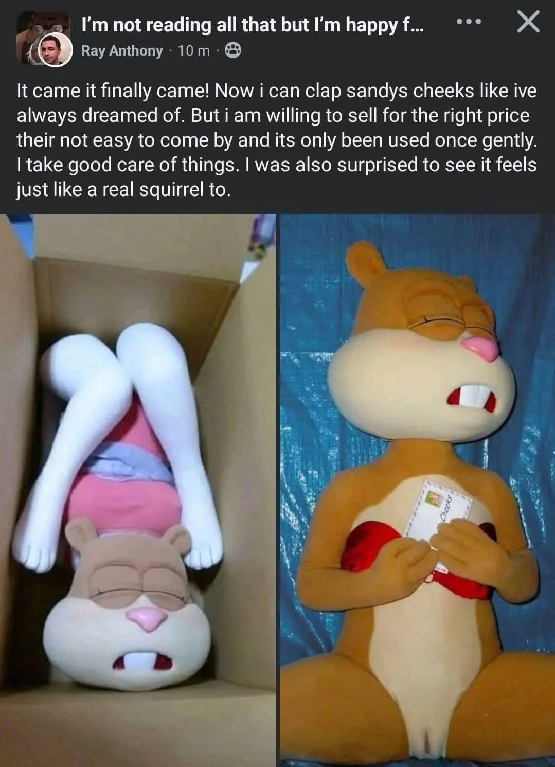 Caption: "It came it finally came! Now i can clap sandys cheeks like ive always dreamed of. But i am willing to seel for the right price their not easy to come by and its only been used once gently. I take good care of things. I was also surprised to see it feels just like a real squirrel to."