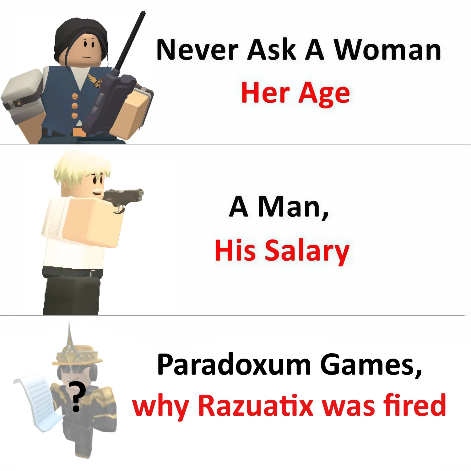 Caption: "Never Ask A Woman; Her Age A Man, His Salary Paradoxum Games, why Razuatix was fired"