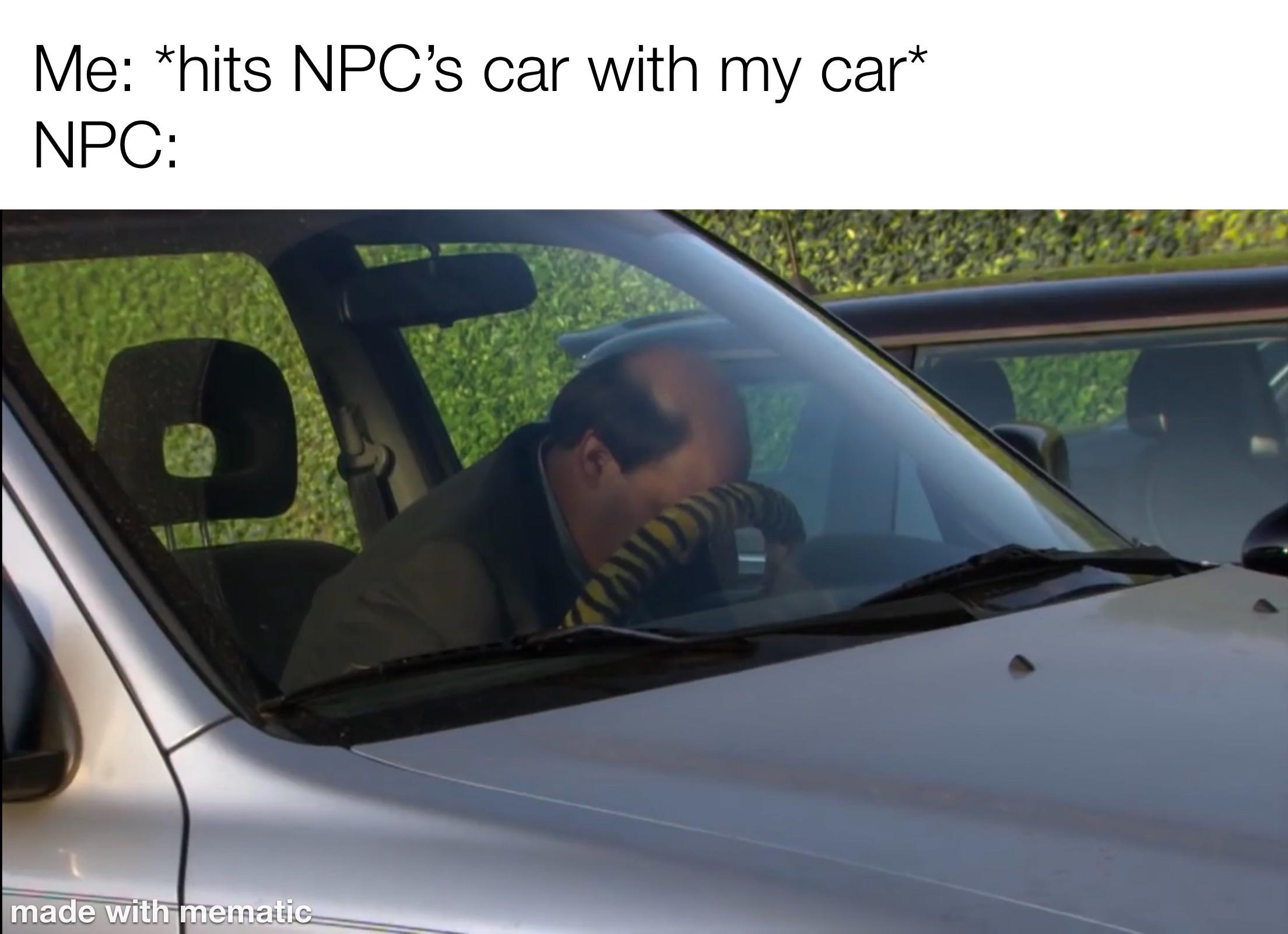 Caption: "Me: *hits NPC's car with my car* NPC:"