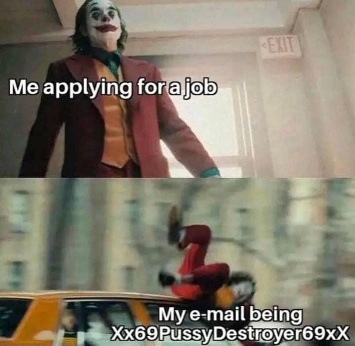 Caption: "Me applying for a job My e-mail being Xx69PussyDestroyer69xX"