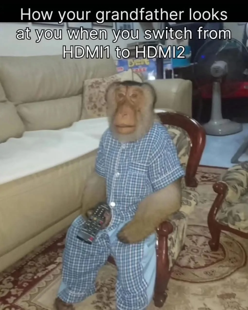 Caption: "How your grandfather looks at you when you switch from HDMI1 to HDMI2"