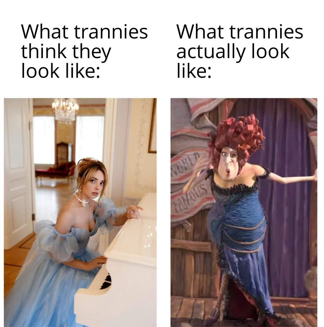 Caption: "What trannies think they look like - What trannies actually look like"