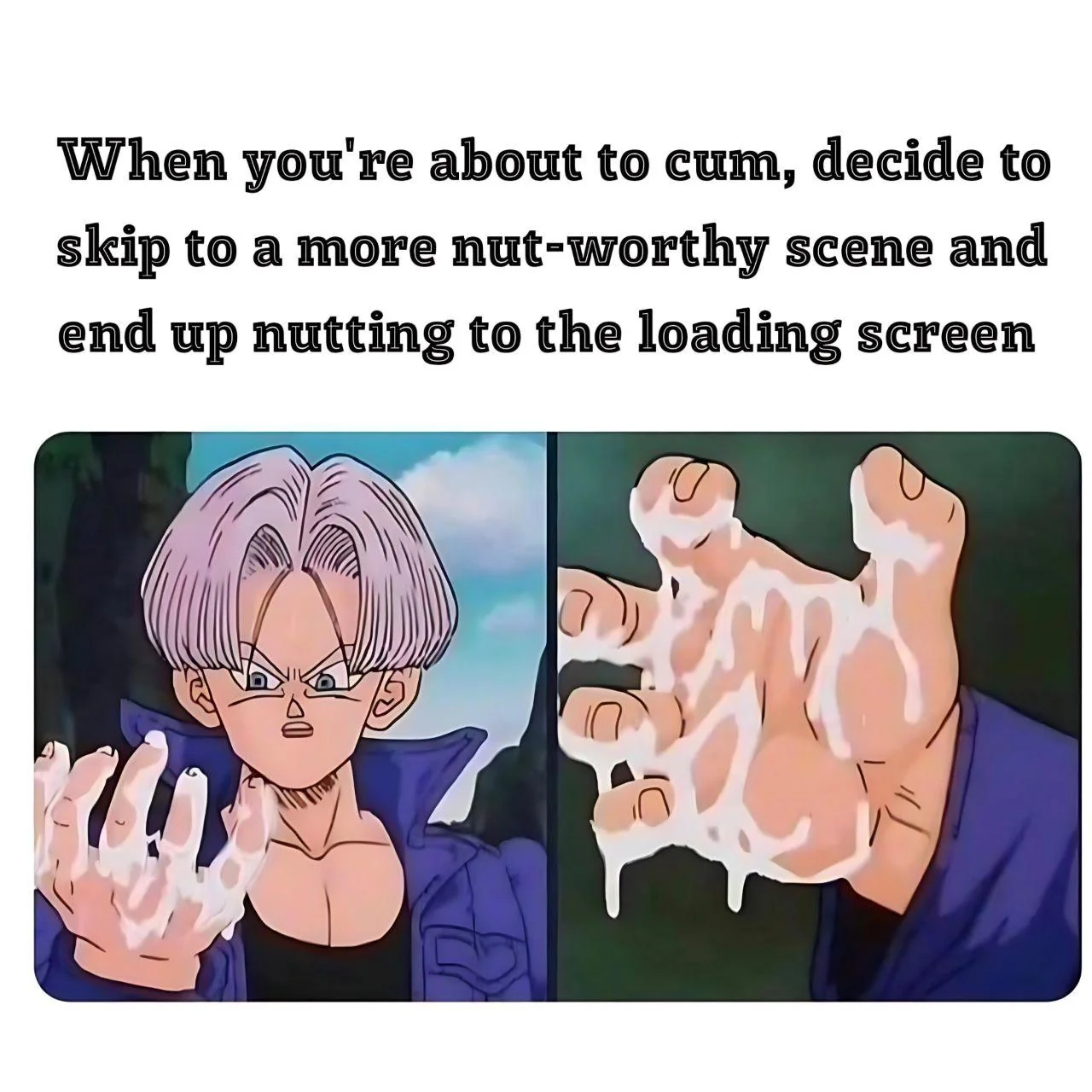 Caption: "When you're about to cum, decide to skip to a more nut-worthy scene and end up nutting to the loading screen"
