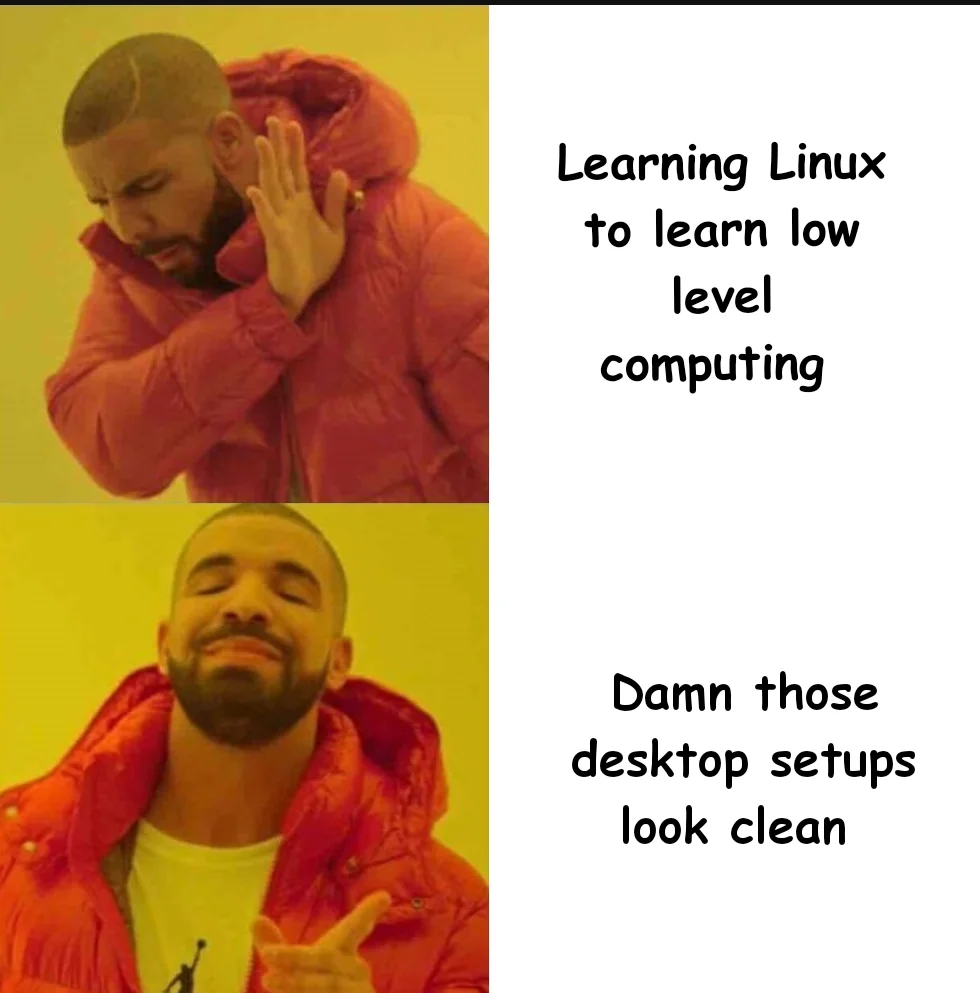 Caption: "Learning Linux to learn low level computing - Damn those desktop setups look clean"