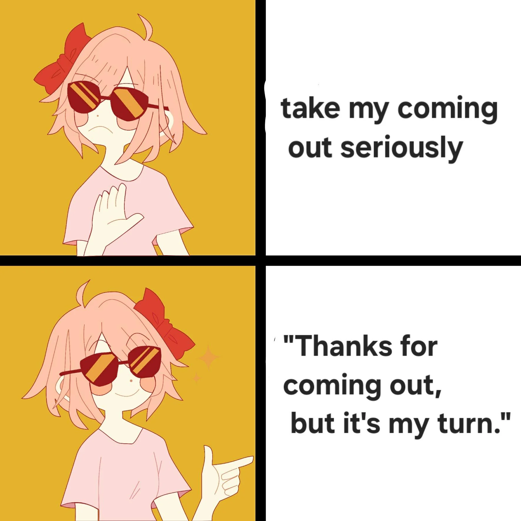 Caption: "take my coming out seriously "Thanks for coming out, but it's my turn""