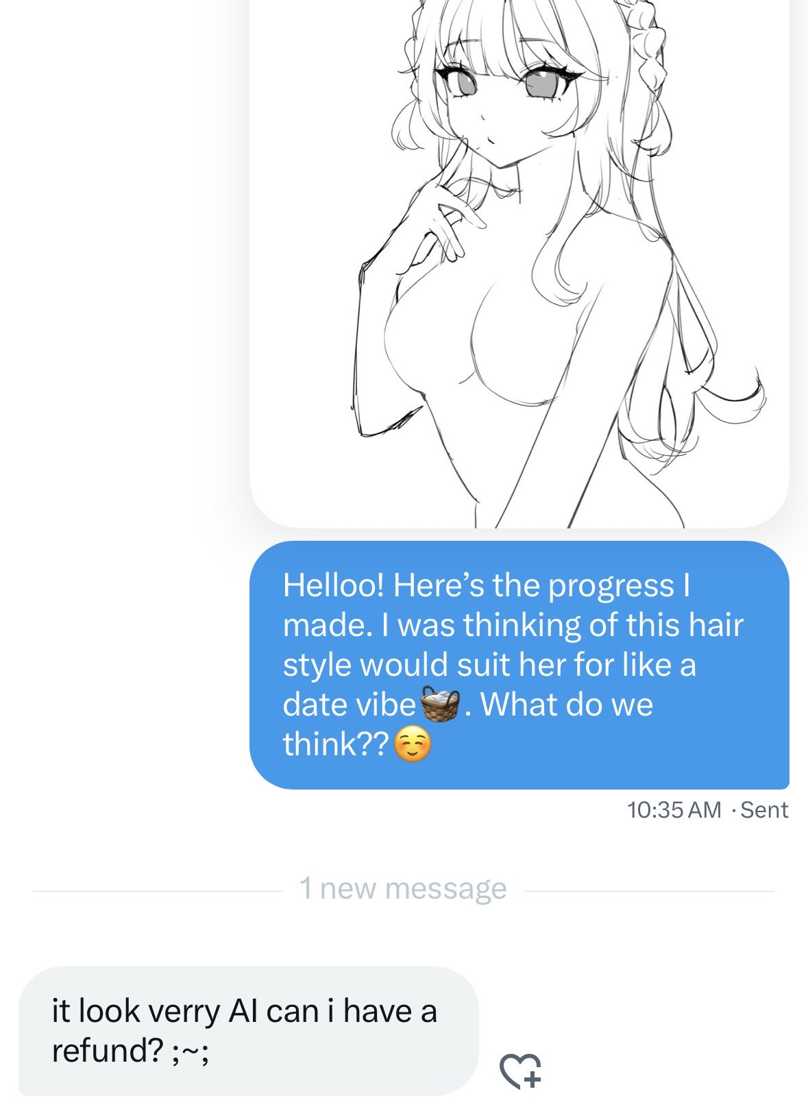 Caption: "Helloo! Here's the progress I made. I was thinking of this hair style would suit her for like a date vibe. What do we think?? βΊοΈ it look verry AI can i have a refund? ;-;"